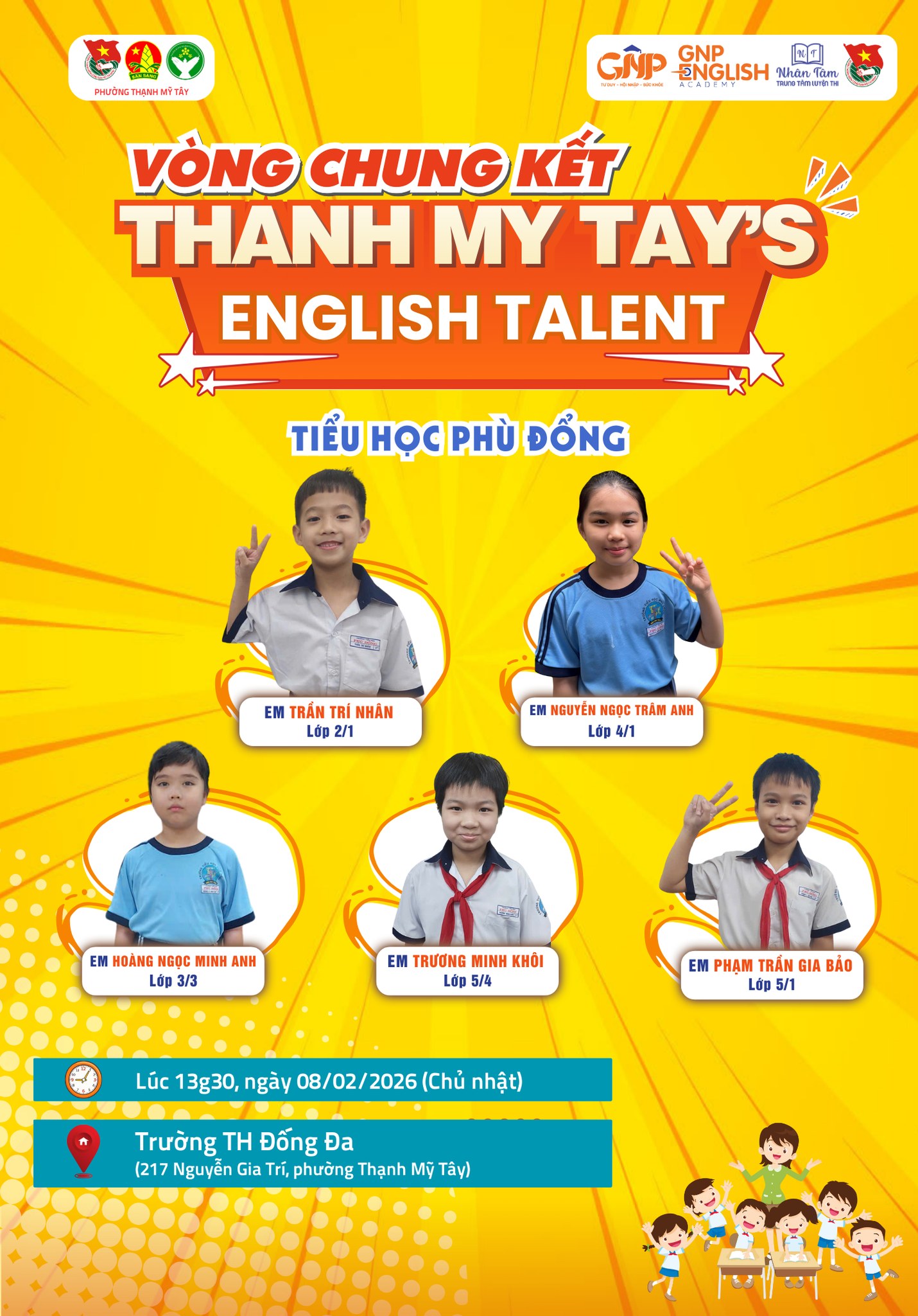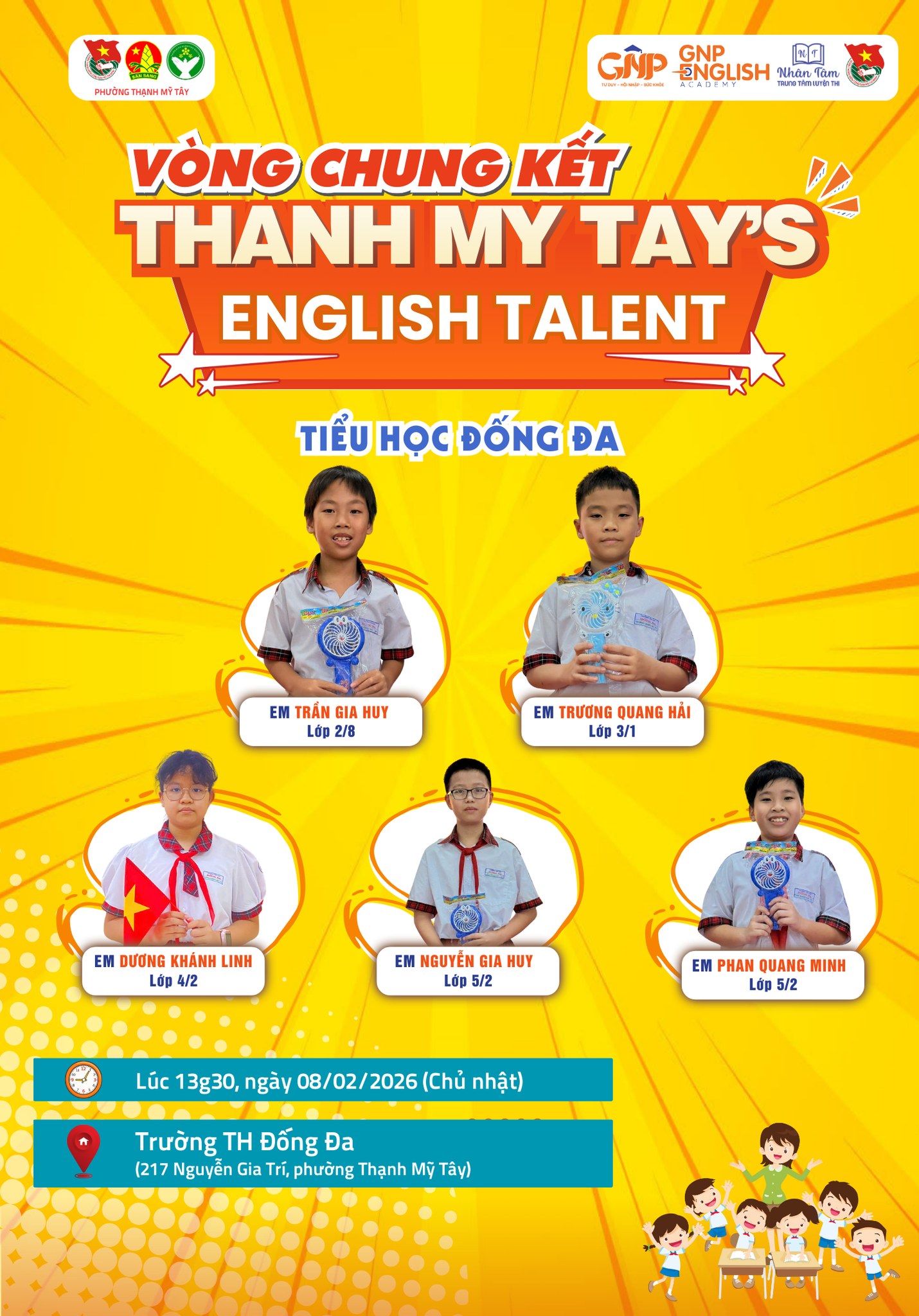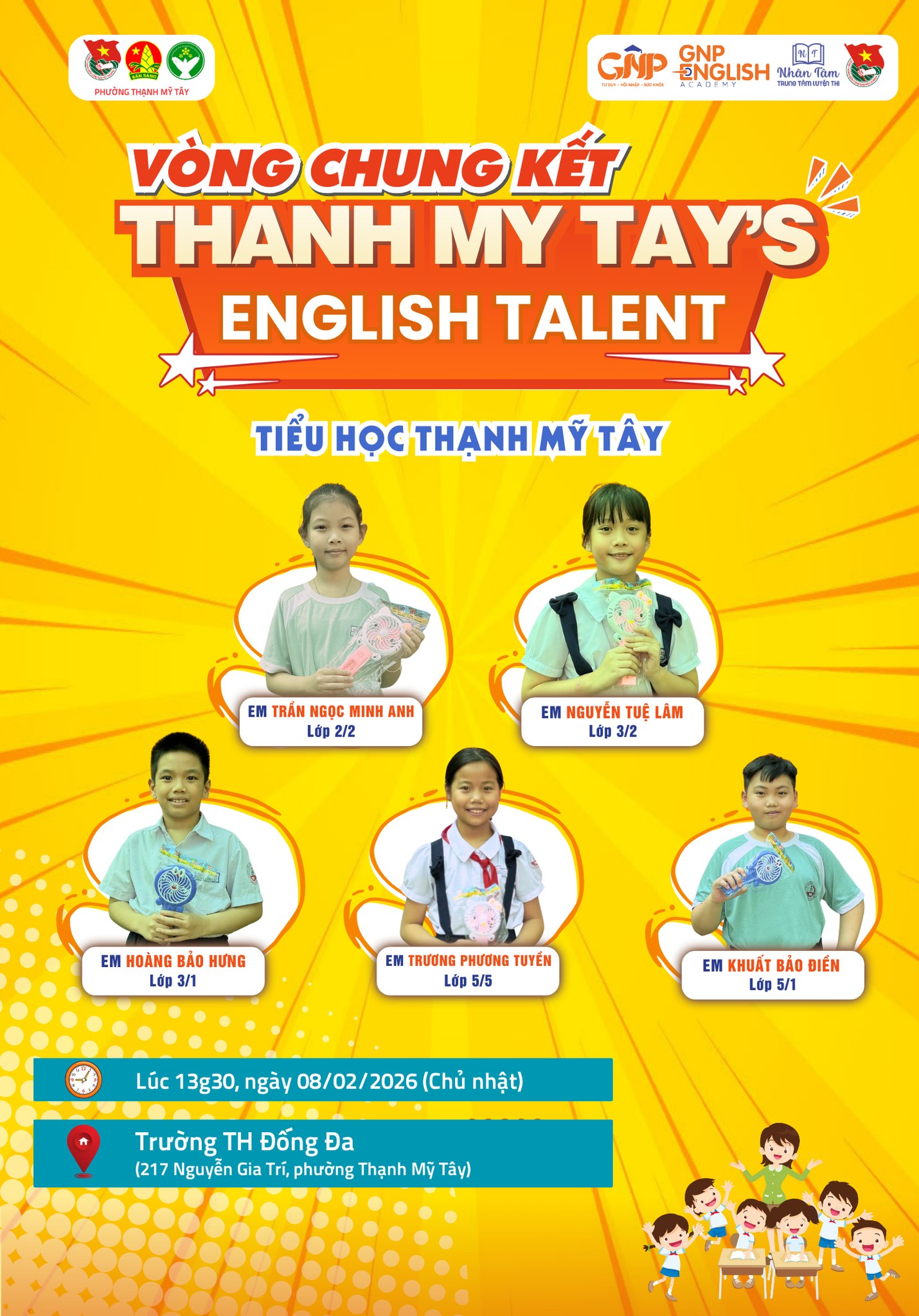Cuộc thi Thanh My Tay’s English Talent do Công ty Cổ phần Giáo dục GNP phối hợp cùng Đoàn phường, Hội đồng Đội phường Thạnh Mỹ Tây tổ chức đã trải qua hành trình Bán kết đầy sôi động tại các trường Tiểu học trên địa bàn phường Thạnh Mỹ Tây