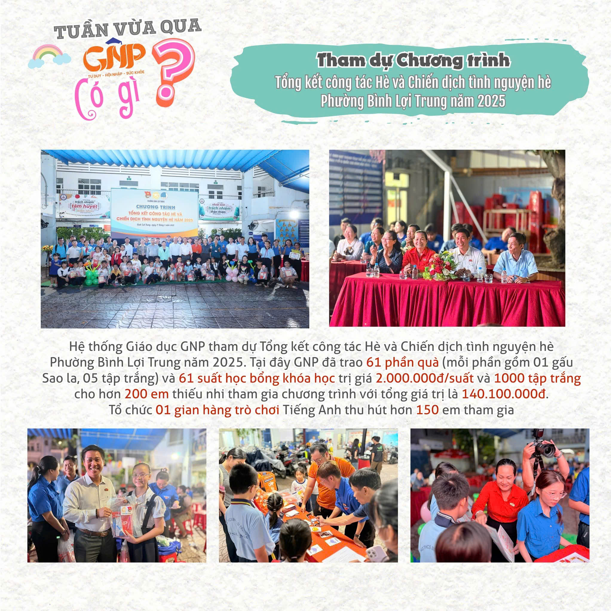 🎉 Tổng kết công tác Hè và Chiến dịch tình nguyện hè Phường Bình Lợi Trung năm 2025: Tại chương trình GNP đã trao tặng 61 phần quà (mỗi phần gồm 01 gấu Sao la, 05 tập trắng), 61 suất học bổng khóa học trị giá 2.000.000đ/suất và 1000 quyển tập trắng cho hơn 200 em thiếu nhi tham gia chương trình với tổng giá trị trao tặng lên tới 140.100.000đ, đồng thời tổ chức 01 gian hàng trò chơi Tiếng Anh thu hút đông đảo các em tham gia.
