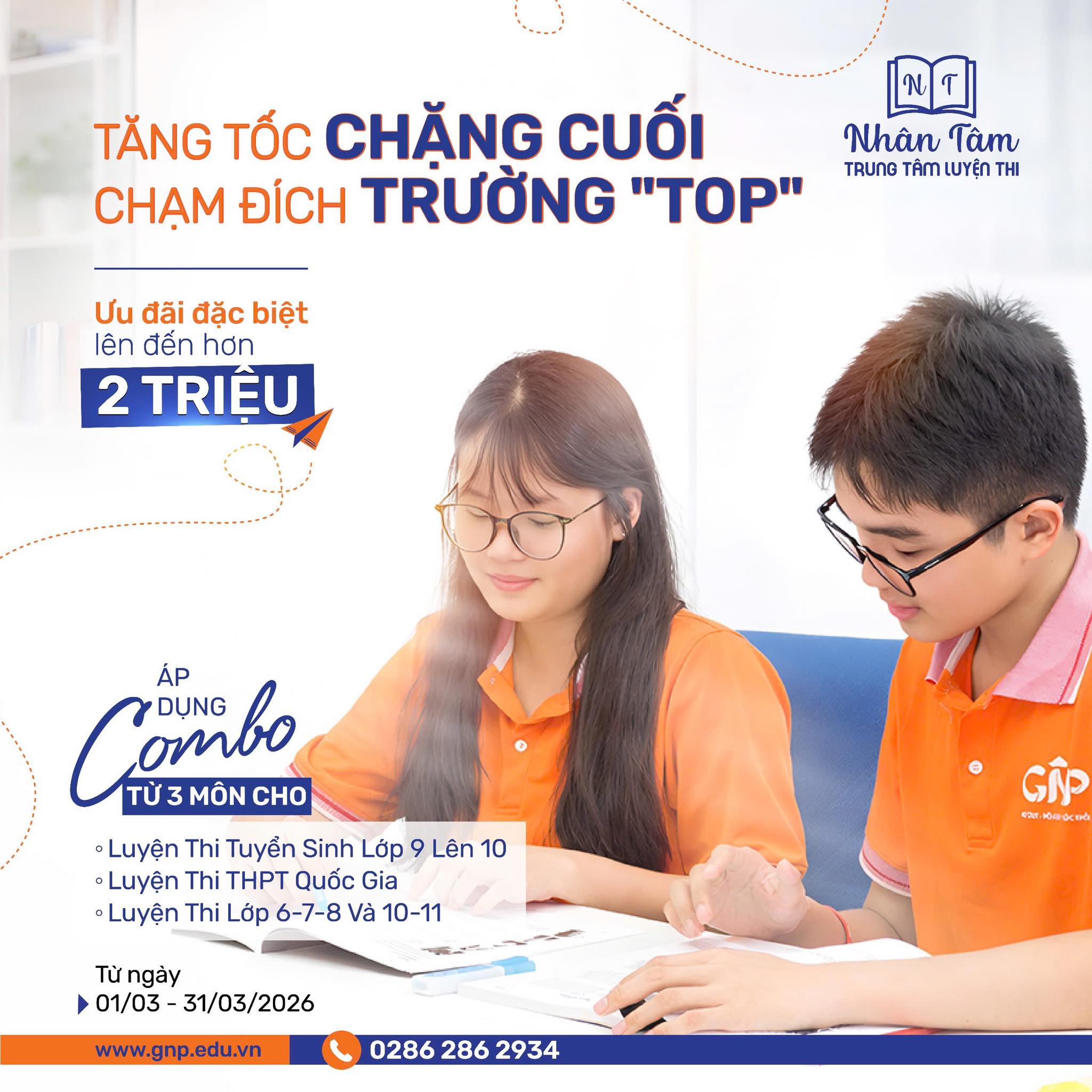 Thấu hiểu những áp lực đó, Luyện Thi Nhân Tâm triển khai chương trình ưu đãi đặc biệt – chỉ có trong tháng 3 này nhằm giúp học sinh tăng tốc ôn tập và tự tin bứt phá điểm số.